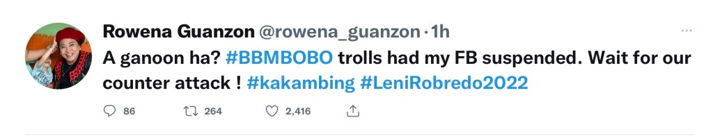 MANILA, Philippines (The Adobo Chronicles, Manila Bureau) – Ex-Comelec Commissioner Rowena Guanzon took to Twitter to complain that Facebook had suspended her account. She blamed supporters of former Senator and presidential aspirant Bongbong Marcos for this unfortunate penalty.