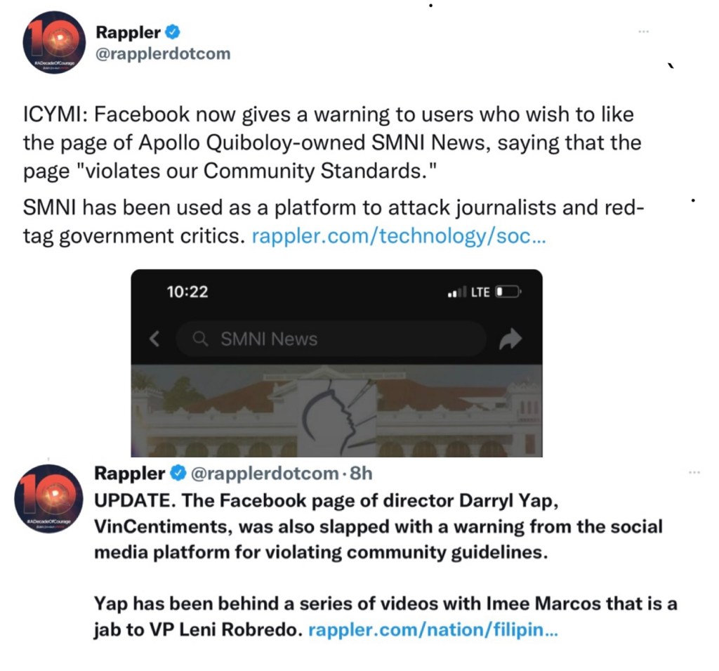 Rappler, known for its anti-Duterte and anti-Marcos stance, appeared to rejoice and celebrate over Facebook’s decision to warn viewers of the SMNI news network and film director Darryl Yap’s Facebook pages for alleged fake news and propaganda.