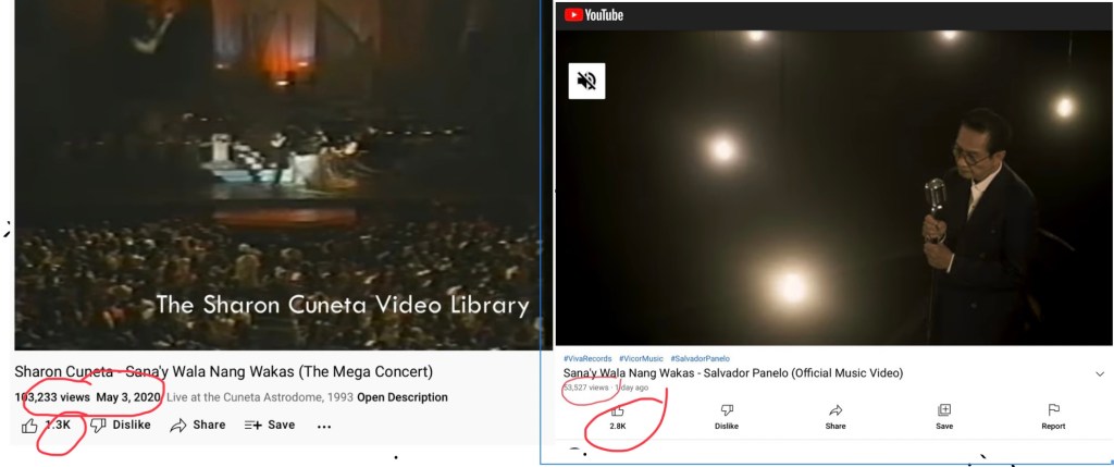In contrast, Cuneta’ YouTube video of one of her concerts in which she sang the same song had over 100,000 views and 1.3K views. And the Cuneta video has been up on YouTube since 2020.