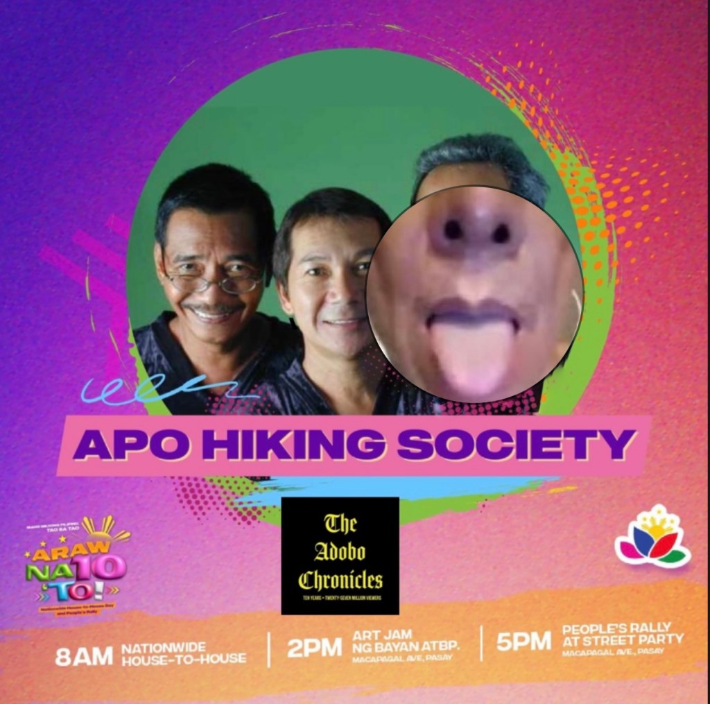 Today, the Leni-Kiko campaign barnstorms in Pasay City, capped by a LIVE show by Dilawan/Pinklawan poster boy Jim Paredes. He will be joined by the other former members of the Apo Hiking Society in their first reunion since their breakup.