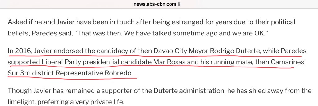 Others noted that Javier is known to be a supporter of President Rodrigo Duterte as confirmed by no less than ABS-CBN. Duterte’s daughter Sara is running for Vice President in tandem with former Senator Bongbong Marcos.