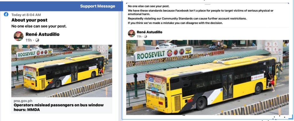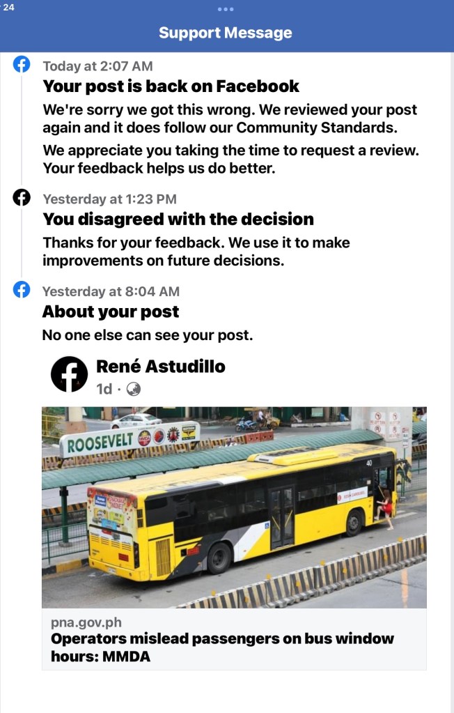 Now the mere act of posting a photo of a bus merited the post being hidden by Facebook. It so happened that it was our publisher who posted the photo. There was no nudity, violence, misinformation or threat in the photo — just a straightforward picture of a city bus along Metro Manila’s longest thoroughfare, EDSA!
