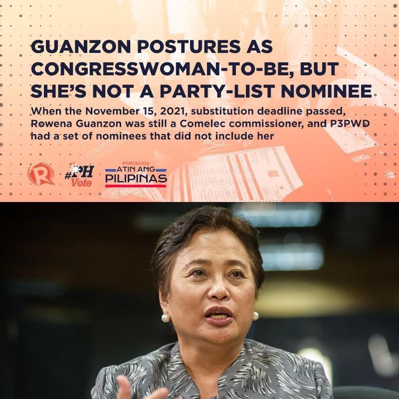 Now, Rappler, the least-trusted news brand in the Philippines whose CEO Maria Ressa is a convicted criminal, is reporting that Guanzon is not among the nominees of the said partylist, noting that when the deadline for nominee substitution happened Guanzon was still a Comelec Commissioner.