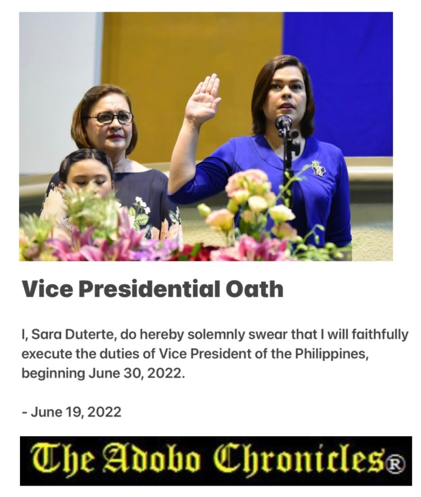 DAVAO CITY, Philippines (The Adobo Chronicles, Davao Bureau) – Presumptive Vice President Inday Sara Duterte announced that she will take her oath of office 11 days early, in Davao City.