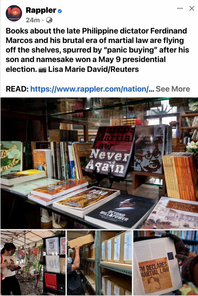 MANILA, Philippines (The Adobo Chronicles, Manila Bureau) – Rappler, the least-trusted news brand in the Philippines whose CEO Maria Ressa is a convicted criminal, is reporting that books about the late great President Ferdinand E. Marcos and his Martial Law regime are flying off the shelves, describing it as ”panic buying.”
