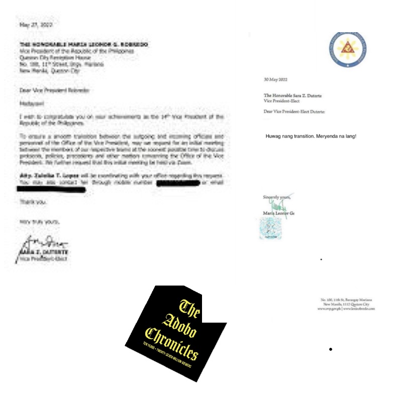 QUEZON CITY, Philippines (The Adobo Chronicles, Quezon City Bureau) – Vice President Leni Robredo, newly-arrived from a well-deserved junket in New York, has quickly responded to a letter from VP-elect Inday Sara Duterte requesting a meeting for a smooth transition to the new administration.
