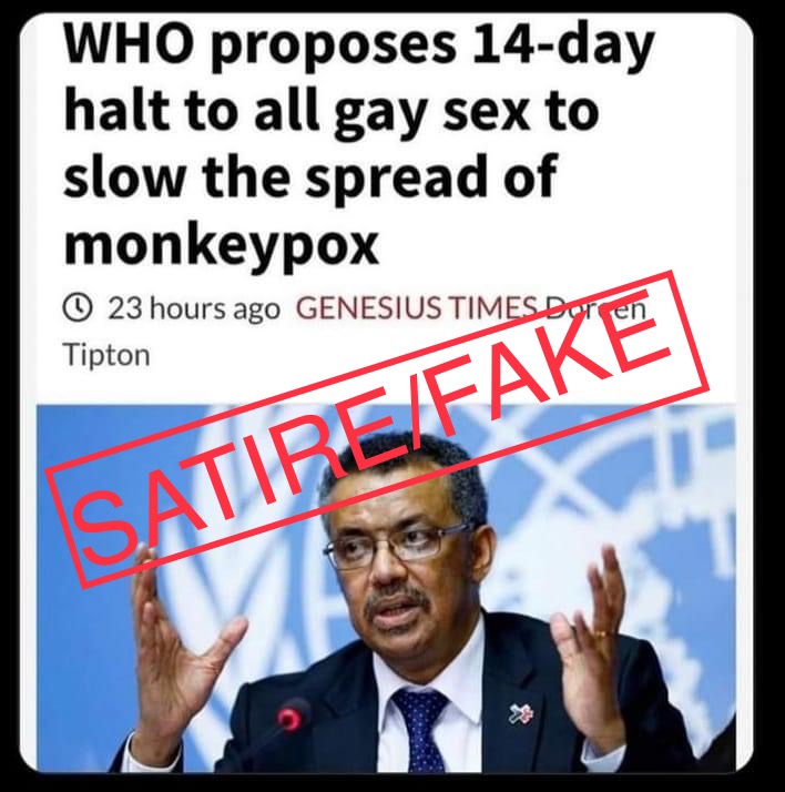 A supposed news headline has spread on the Internet where the World Health Organization (WHO) ”advised” gay and bisexual men to halt sexual activity for a 14-day period to slow the spread of the monkeypox virus.
