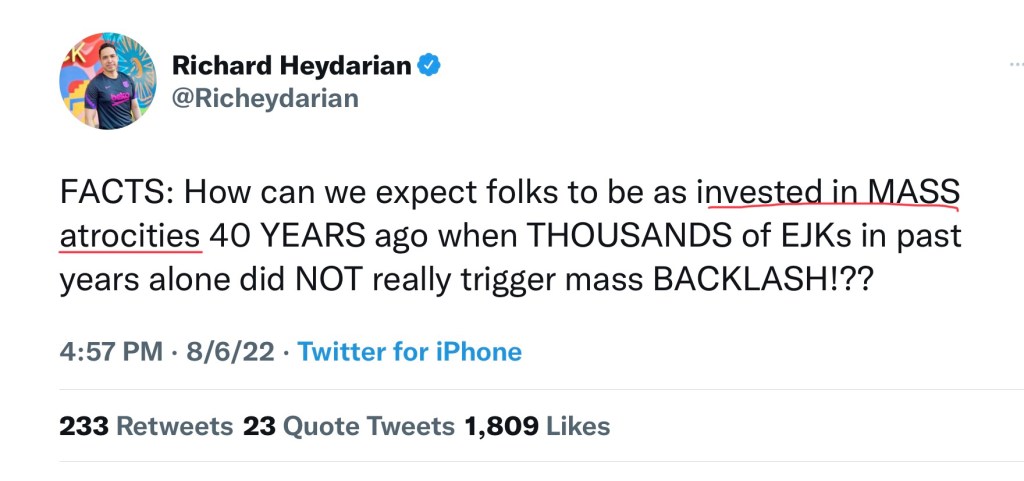 In a tweet that also made reference to EJK killings in the past few years, Heydarian said that we should not “expect folks to be as invested in MASS atrocities…”
