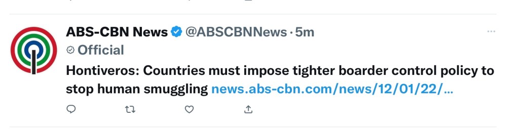 MANILA, Philippines (The Adobo Chronicles, Manila Bureau) – ABS-CBN News is reporting that Opposition Senator Risa Hontiveros is calling for tighter boarder control to curb human trafficking.