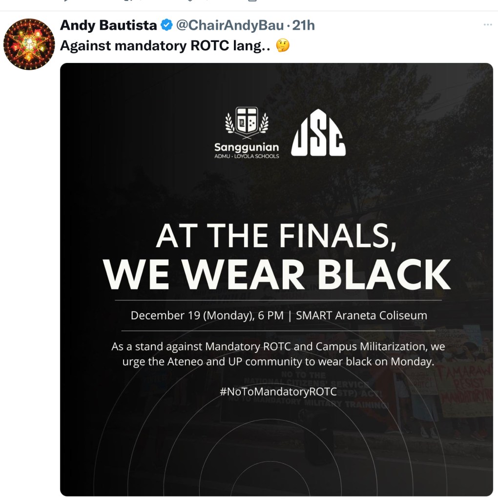 His return to the Philippines was announced by Bautista himself on his Twitter account, and will reportedly attend the final UAAP game between U.P. and Ateneo at the Araneta Coliseum in Quezon City.