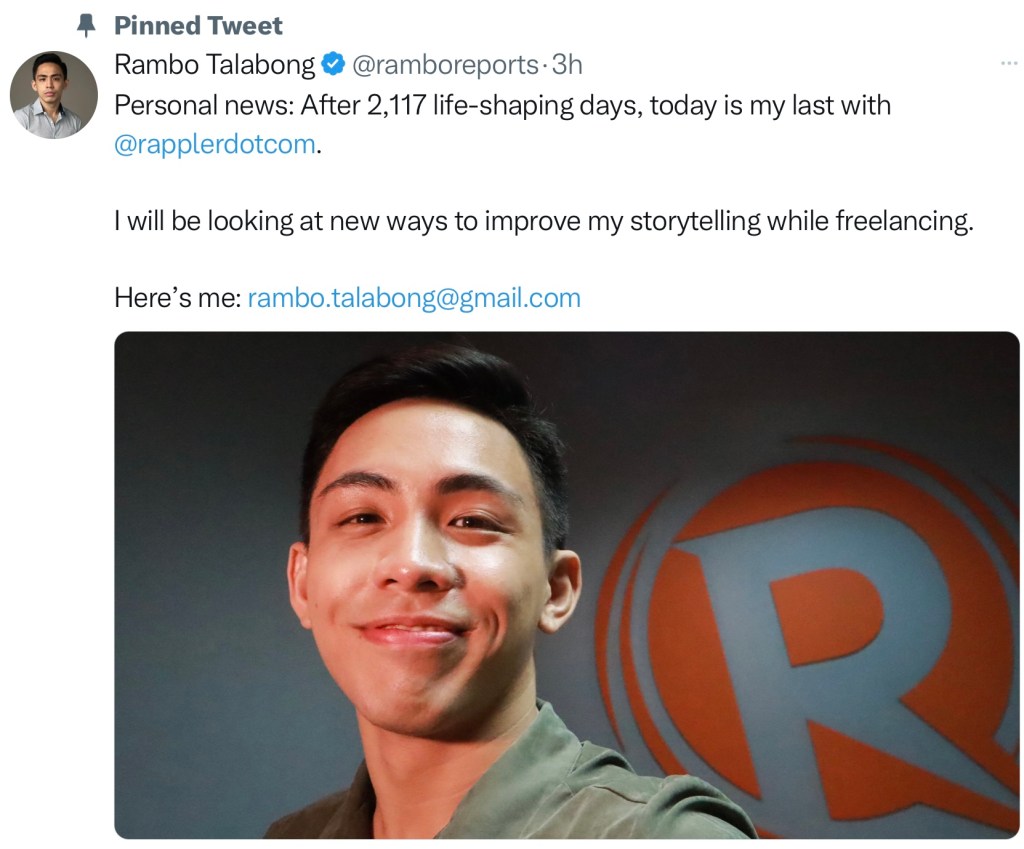 MANILA, Philippines (The Adobo Chronicles, Manila Bureau) – Rappler’s “star reporters” seem to be biting the dust one after another (moving on, being on sabbatical or on leave) : Lian Buan. Mara Cepeda. Pia Rañada. Now, Rambo Talabong is leaving Maria Ressa’s angels and is going freelance.