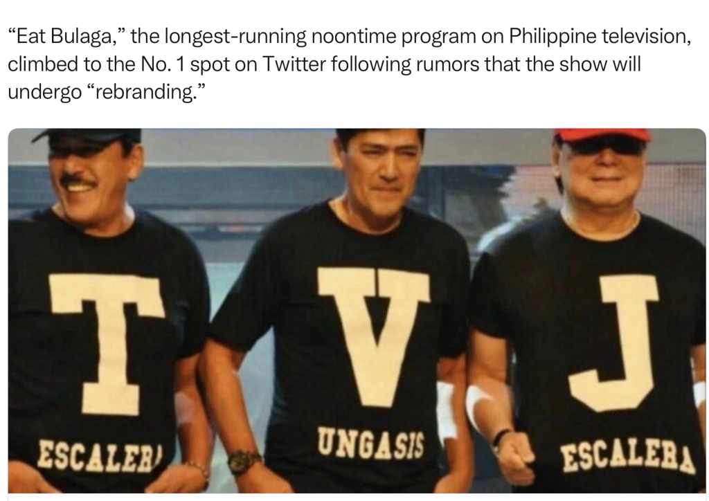 Now, the equally long-running noon-time TV series, “Eat Bulaga” is also re-branding and will be re-titled “Mga Batang Kyusi.” (Kyusi is the colloquial term for Quezon City).