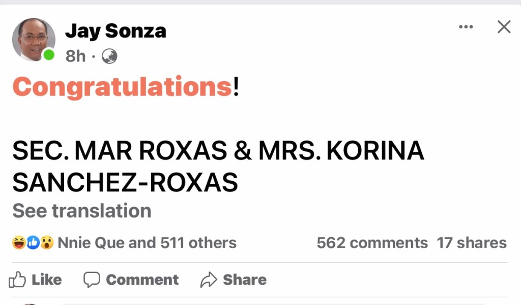 MANILA, Philippines (The Adobo Chronicles, Manila Bureau) – Social media in the Philippines was abuzz with speculation and gossip after former broadcaster Jay Sonza posted a congratulatory message to former Senator Mar Roxas and wife Korina Sanchez. Sonza didn’t explain his post.