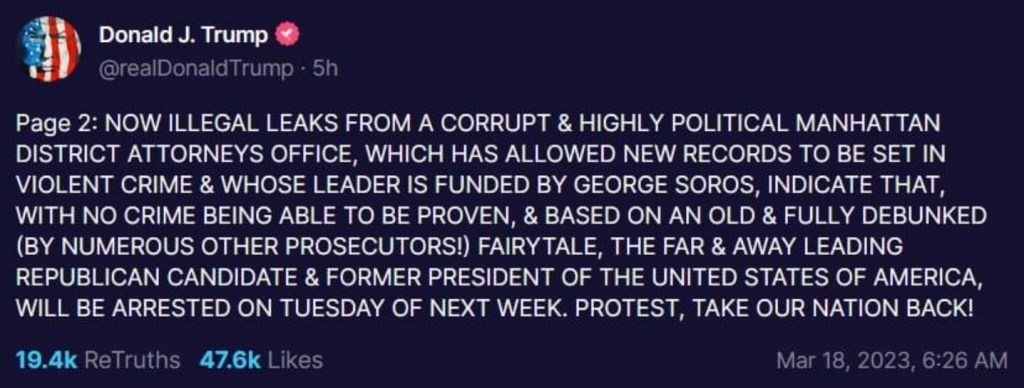 In a post on the social media platform Truth Social, Trump announced that he is expected to be arrested on Tuesday, asking his loyal followers to protest and take America back (from the Americans).