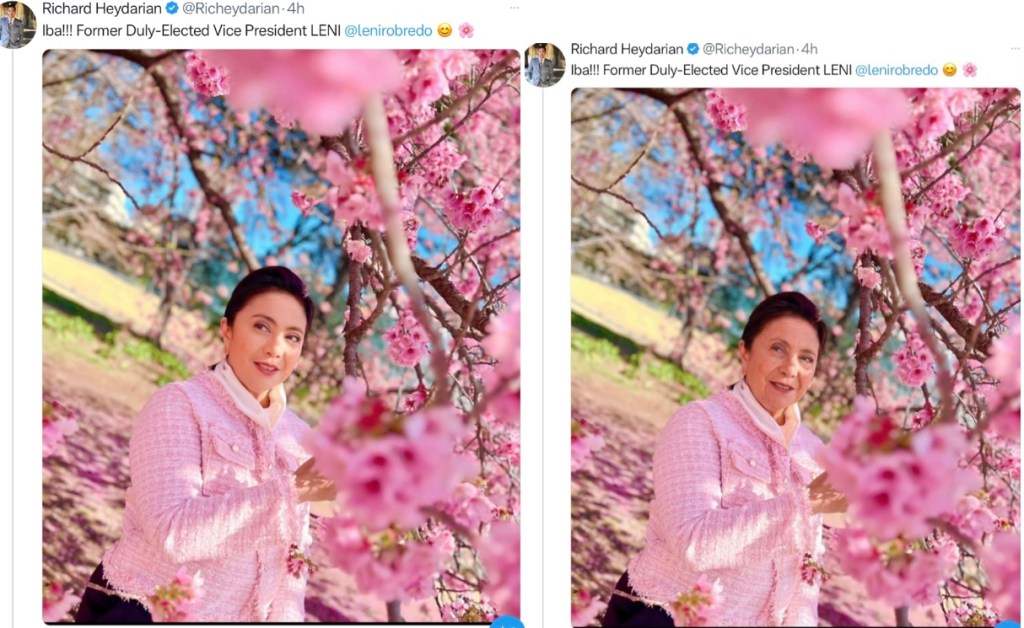 Heydarian posted two photos of Robredo in what appeared to be a selfi amid cherry blossoms in Japan (or is it Washington, D.C.?). One photo showed the Robredo photo without filter and the other, with filter.