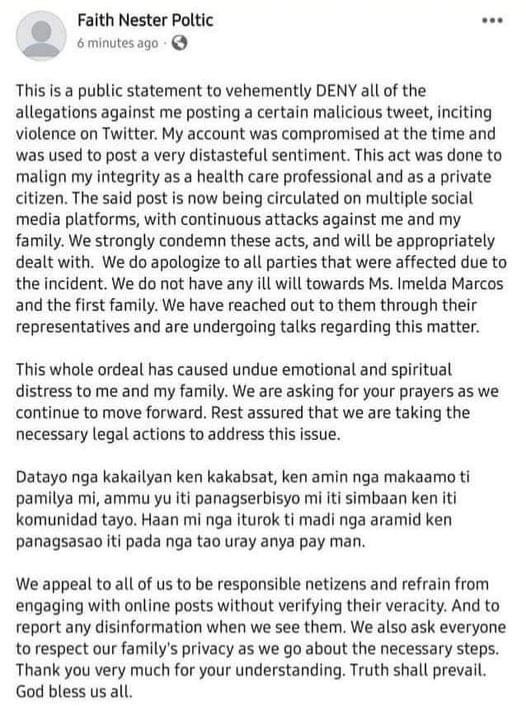 In the statement, the attorney said the nurse’s account has been hacked and that she would never wish Mrs. Marcos to be harmed.