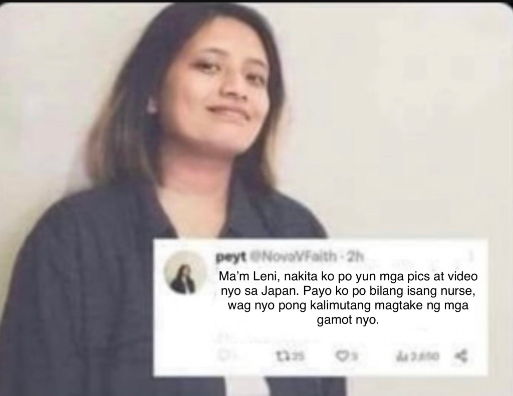 In a complete turnaround, Faith (her real name) showed utmost compassion for ex-Vice President Leni Robredo. In a tweet, Peyt advised Robredo to make sure she takes her (psychiatric) medication after seeing the latter’s photos and video in Japan, posing as a Samurai warrior (warriess)?