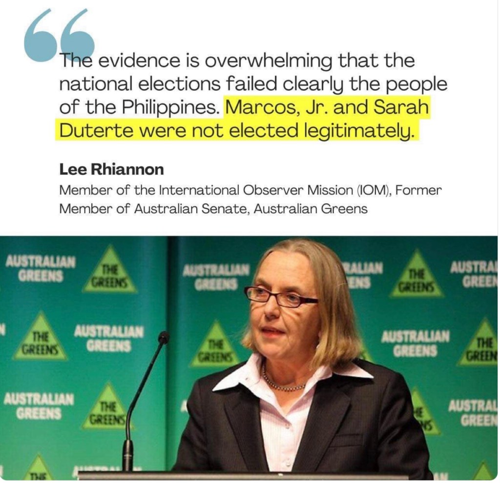 On the contrary, the Australian observer maintained that “the evidence is overwhelming. . .that Marcos, Jr. and Sarah (sic) Duterte were not legitimately elected.”
