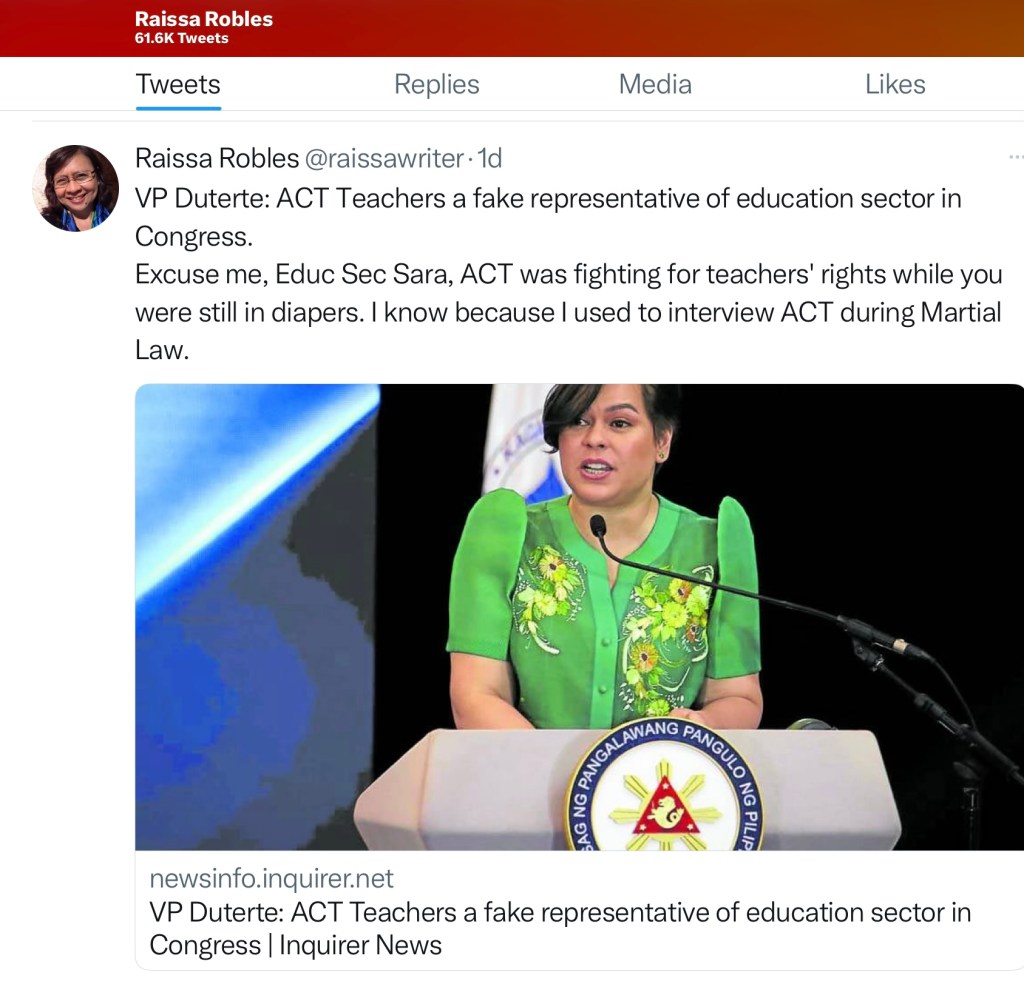 Robles criticized Duterte for calling the Alliance of Concerned Teachers (ACT) a “fake representative of the education sector in Congress.”