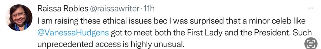In a tweet, presumably because she was not allowed to interview Filipino American Vanessa Hudgens, Robles called the Hollywood star a “minor celebrity.”