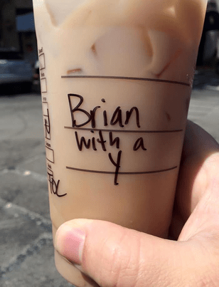 When the employee finally called out the customer’s name, he shouted, “Iced mocha for Brian with a y.”