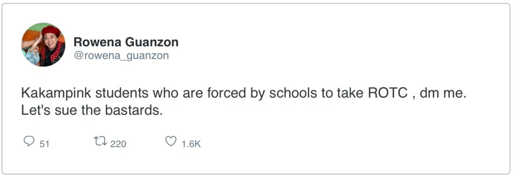 In a post on her Twitter account, she called on all KAKAMPINKS who are being forced to under through ROTC (Reserved Officers Training Course) to contact her so that she could help them file a lawsuit.