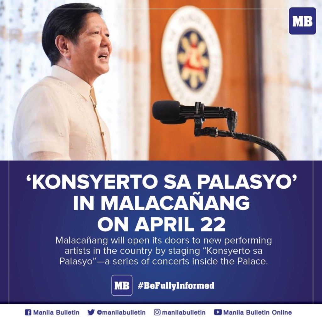 Beginning this month, Malacañang will host a series of concerts at the presidential palace. Artists from all over the country — those with the calibre not associated with Vice Ganda and company — be invited to perform in “Konsyerto Sa Palasyo.” The first is in the series will be held on April 22.