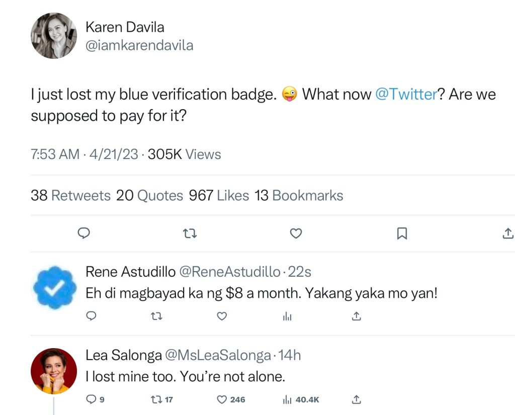Case in Point: News and Talk Show anchor Karen Davila has complained that her verified Twitter account — with the blue check — has disappeared from her profile. It doesn’t matter that international artist Lea Salonga responded that she, too, has had the same experience.