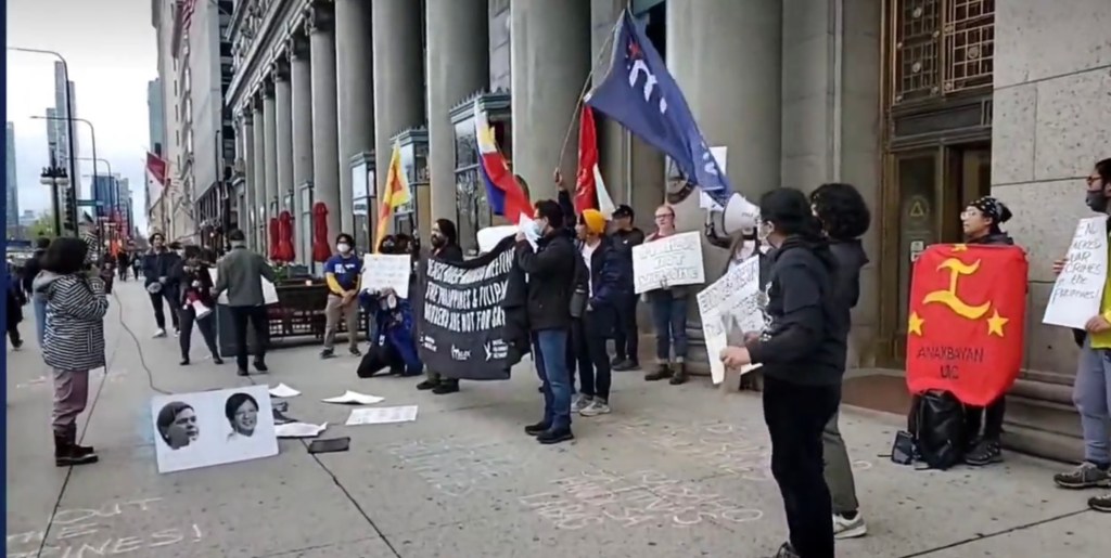 The group was protesting the state visit to the U.S. of Philippine President Bongbong Marcos, chanting “Marcos is not welcome here.”
