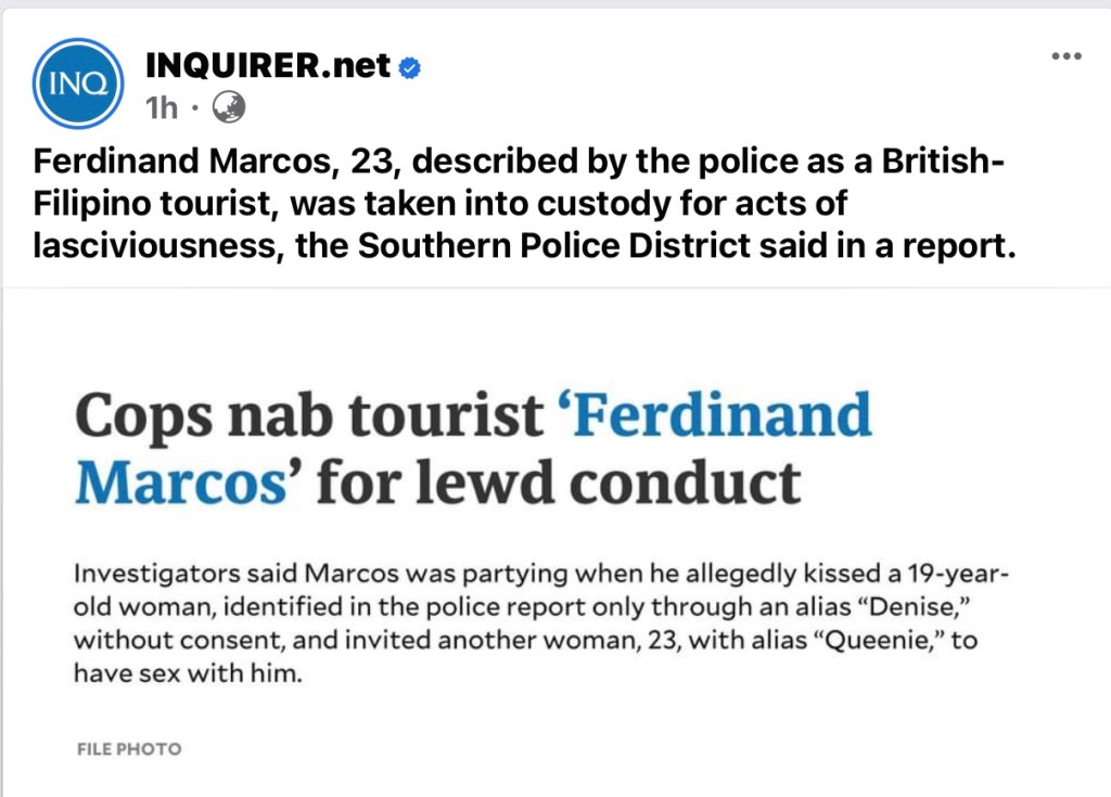 But a check by The Adobo Chronicles confirmed that the Marcos arrested was not the President but a British-Filipio tourist accused of molesting women in Taguig, Rizal, as reported by the Inquirer: