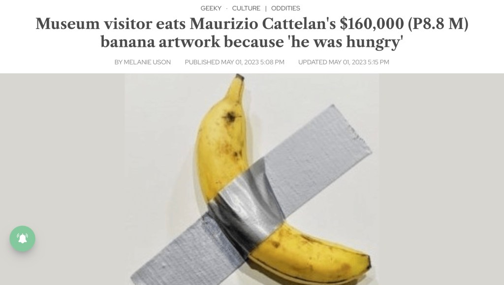 Rather, our very own publisher at The Adobo Chronicles was invited to display his original artwork at the Louvre museum in Paris, France. Our publisher’s artwork features a Chinese eggplant attached to a canvas with white tape. He was offered $200,000 to display at the museum, plus free roundtrip ticket at hotel accommodation to attend the opening of the exhibit.