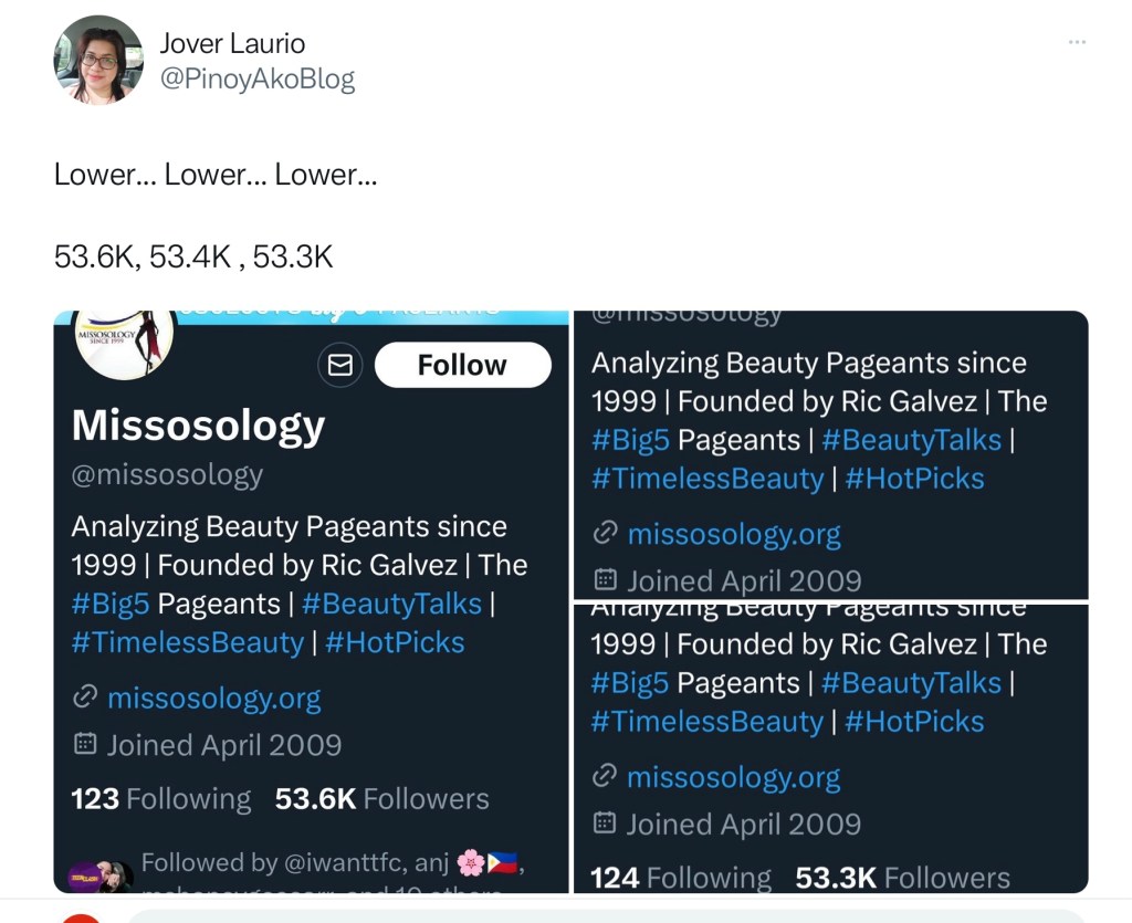 Beauty enthusiasts follow the site for the most up-to-date pageant news, but vlogger Pinoy Ako Blog (Jover Laurio) is watching the site’s numbers. She hates beauty so she finds delight when the number of Missosology’s followers goes on a downward trend.