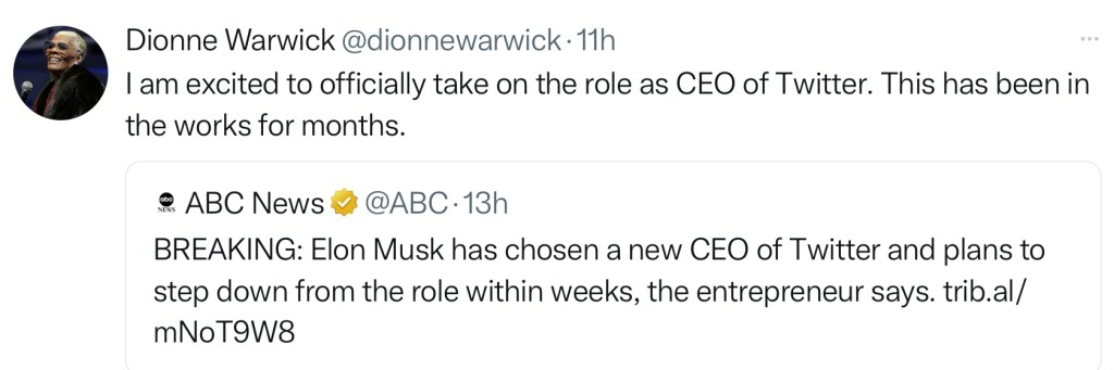 While Musk has not mentioned any name, legendary singer Dionne Warwick tweeted that she has accepted the position after months of negotiations.