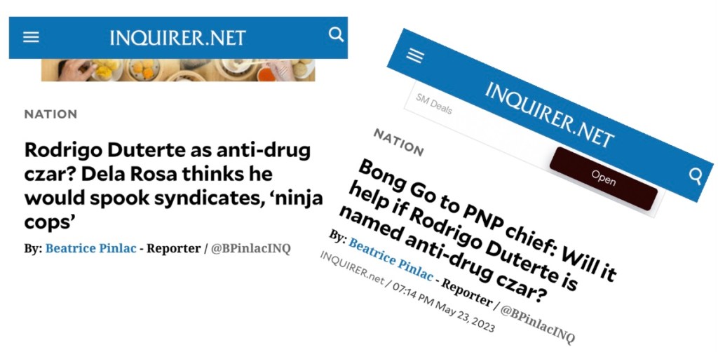 Senators Bong Go and Bato de la Rosa — known to be among the closest confidants of Duterte — have proposed to Marcos that the former president be appointed the country’s Drug Czar.
