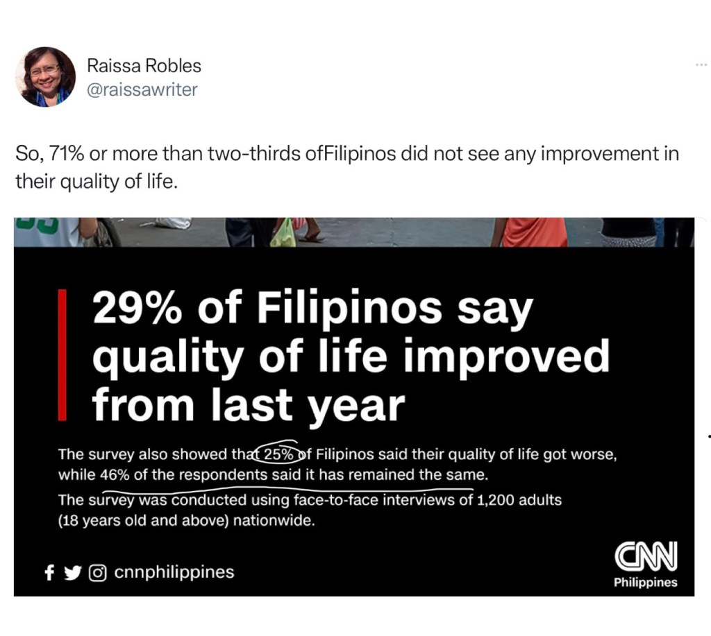 Commenting on a recent poll showing 29% of Filipinos who said their quality of life improved in the last year compared to 25% who said it got worse, Robles drew her mathematical equation resulting in 71% not seeing any improvement. She, of course added the 46% who said their quality of life remained the same.