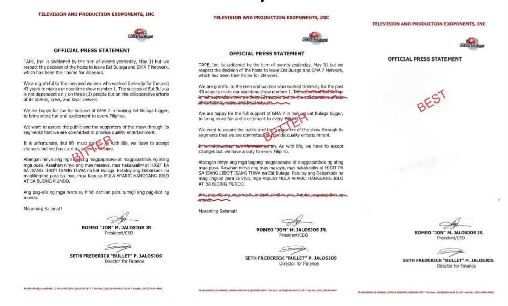 The controversy over the departure of Tito, Vic and Joey from GMA7 and the noontime show, “Eat Bulaga” could have been tempered a bit, had TAPE (Television and Production Exdponents, Inc.) issued a different press statement.