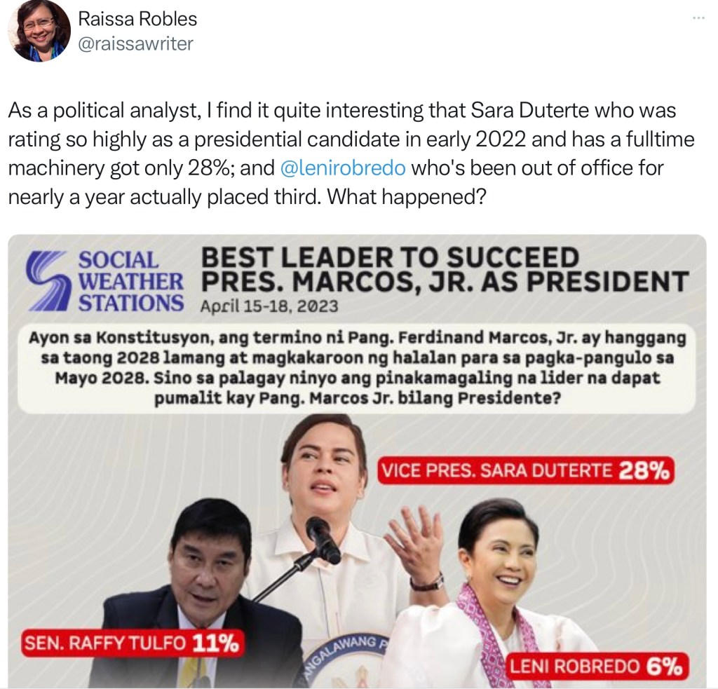 Case in point: In her analysis of a recent SWS survey on potential presidential candidates in the 2028 elections, Raissa Robles questioned why Vice President Sara Duterte garnered only 28% while pointing out that Leni Robredo who has been out of office for almost a year now, came in third!