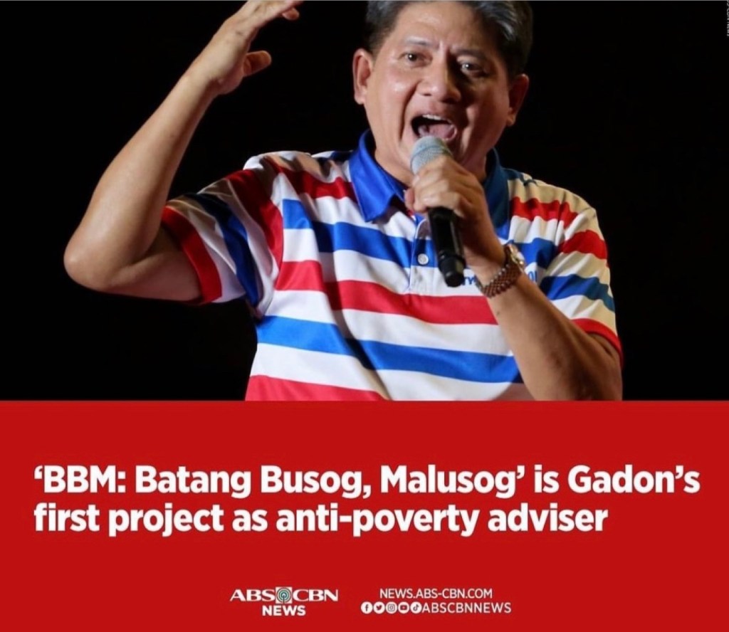 In his first official act as an Administration official, Gadon launched a child feeding program he named BBM – Batang Busog, Malusog (child fed, healthy).