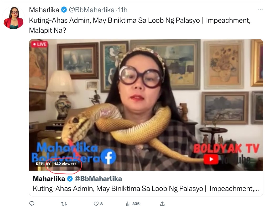 Bb. Maharlika the trying-hard vlogger who claims she helped elect Marcos in the 2022 presidential elections, wrapped her neck with a giant snake during one of hers recent vlogs.