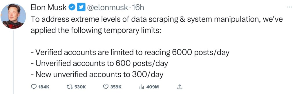 In an earlier tweet, Musk set the tweet reading limits per day for account holders: 6,000 for verified accounts, 600 for unverified accounts and 400 for new unverified accounts.