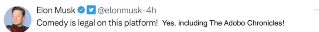 SAN FRANCISCO, California (The Adobo Chronicles, San Francisco Bureau) – In a direct rebuke to Maria Ressa and Rappler, Twitter owner Elon Musk just endorsed The Adobo Chronicles and welcomed the satire site to his socmed platform.