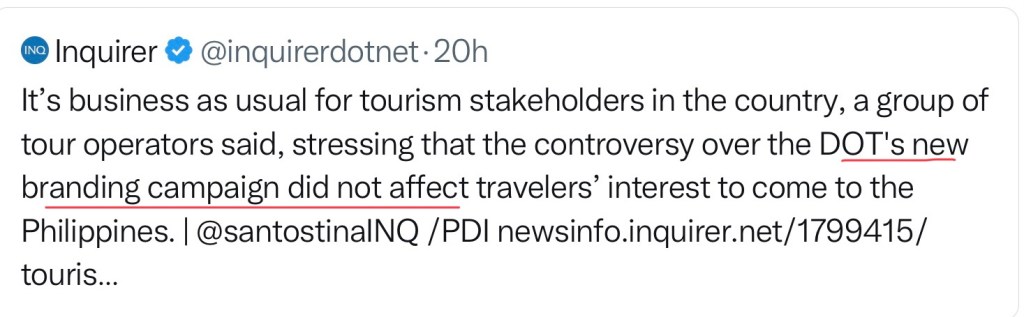 MANILA, Philippines (The Adobo Chronicles, Manila Bureau) – Philippine tourism stakeholders — from airlines to hotels & resorts to travel agencies — have given their verdict: the Department of Tourism’s “Love The Philippines” branding/campaign is INEFFECTIVE and that with or without the new slogan, it’s business as usual for them. It hasn’t increased tourist arrivals either, they said.