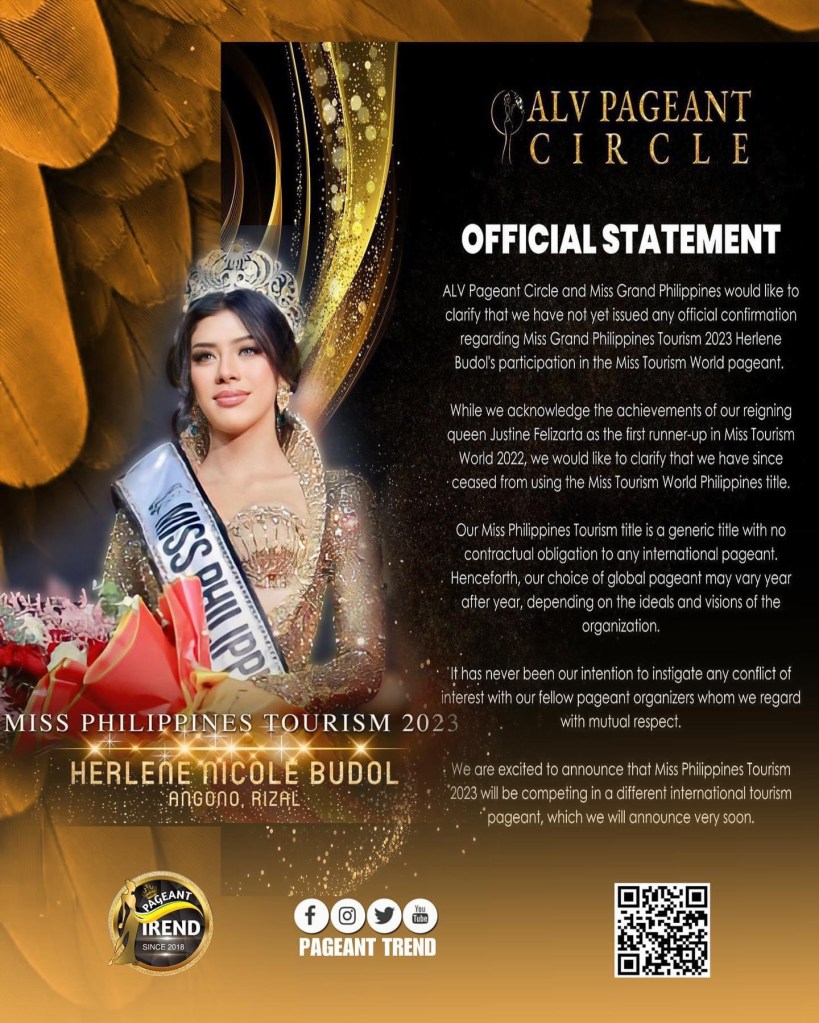 A statement from ALV Pageant Circle and Miss Grand Philippines says that there is yet no assurance that Budol will represent the Philippines in the Miss Tourism World Pageant in London.