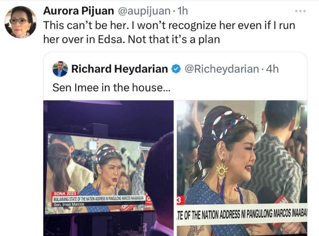 MANILA, Philippines (The Adobo Chronicles, Manila Bureau) – Rumors have it that Senator Imee Marcos is preparing to file grave threat charges against former Miss International (and former Mrs. Manotoc) Aurora Pijuan for a tweet she posted on her social media account.