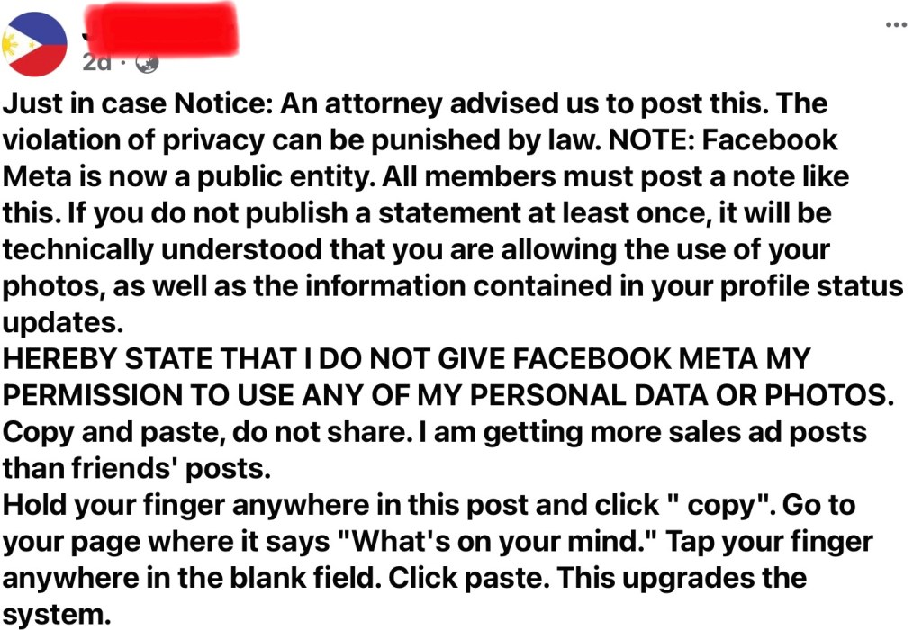 MANILA, Philippines (The Adobo Chronicles, Manila Bureau) – The newest hoax about Facebook/Meta is spreading fast among netizens in the Philippines. Many such hoaxes come around at least once or twice a year.