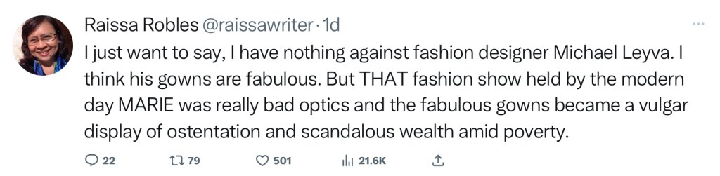 MANILA, Philippines (The Adobo Chronicles – Manila Bureau) – Self-proclaimed investigative writer Raissa Robles couldn’t contain her envy when she criticized a high-end fashion show by calling it a “vulgar display of ostentation and scandalous wealth amid poverty. Featured designer for the show was Michael Leyva.