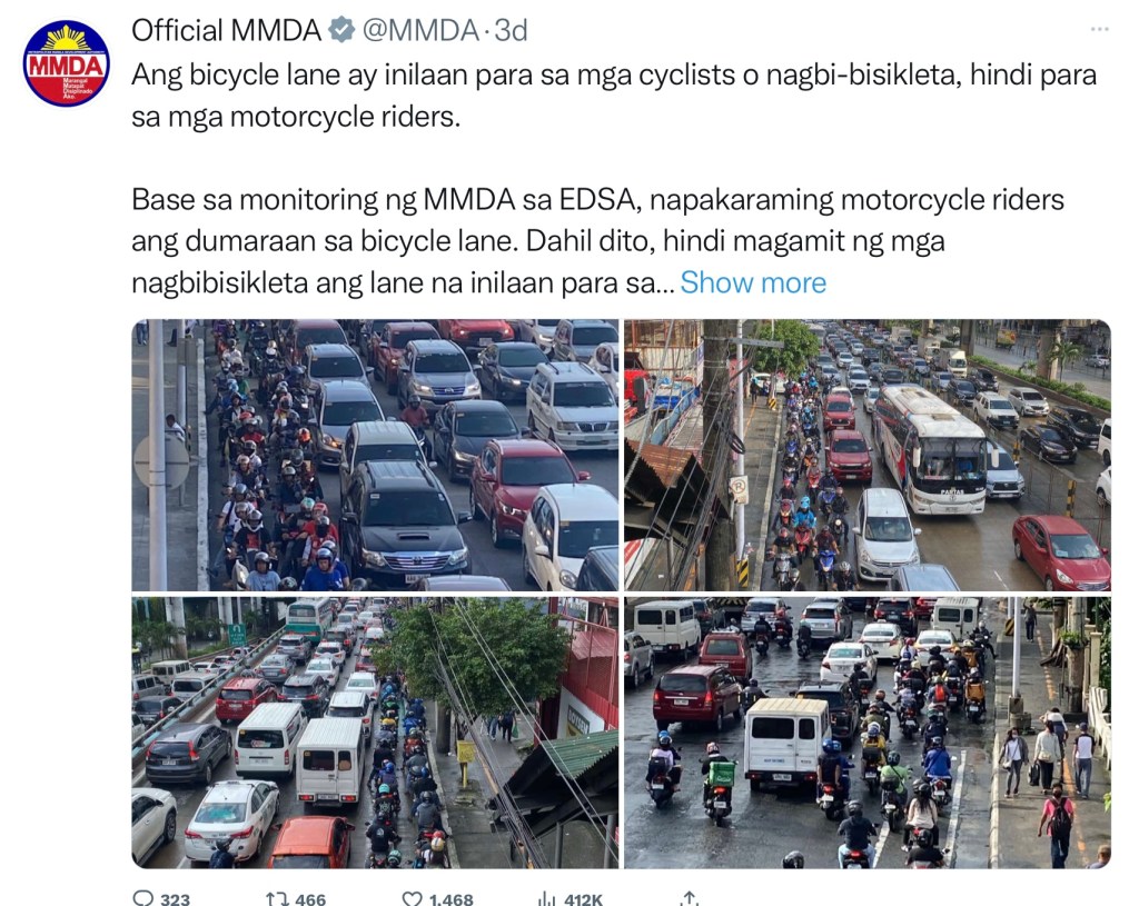 But after MMDA technocrats were told that in most countries, motorcycles are also called motorbikes, they recommended the name change to make clear that the special lanes are for the exclusive use of people who ride manually-pedaled bikes.