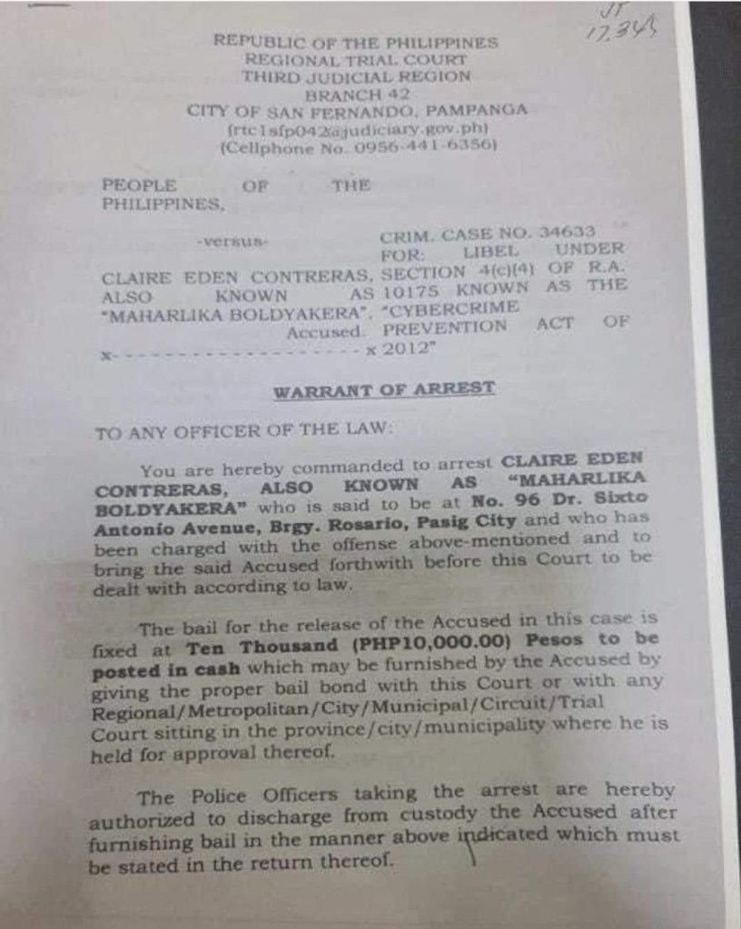 LOS ANGELES, California (The Adobo Chronicles, Los Angeles Bureau) – Claire Eden Contreras, a.k.a. Maharlika Boldyakera, says the address on the warrant arrest issued against her by the Pampanga Regional Trial Court is fake. “I’m living in America,” she proclaimed on her vlog.