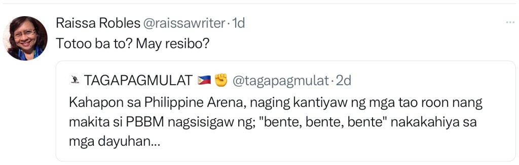 Well, she did another one of those, by re-Xing (re-tweeting) a post by a netizen who claimed that President Bongbong Marcos was met with chants of “bente, bente, bente” when he attended the opening game of the FIBA World Cup at the Philippine Arena. (The chant was supposedly be reference to Marcos’ promise to bring the price of rice to P20 (bente) per kilo.)