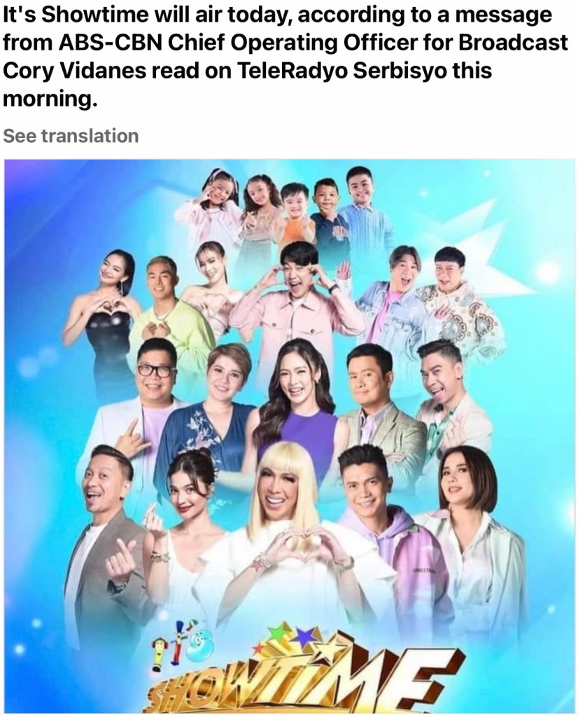 The day after MTRCB imposed a 12-day suspension of “It’s Showtime,” ABS-CBN announced that the noon-time show will air today. (The suspension was due to a previous episode showing hosts Vice Ganda and Ion Perez erotically licking some cake icing in front of kids.)